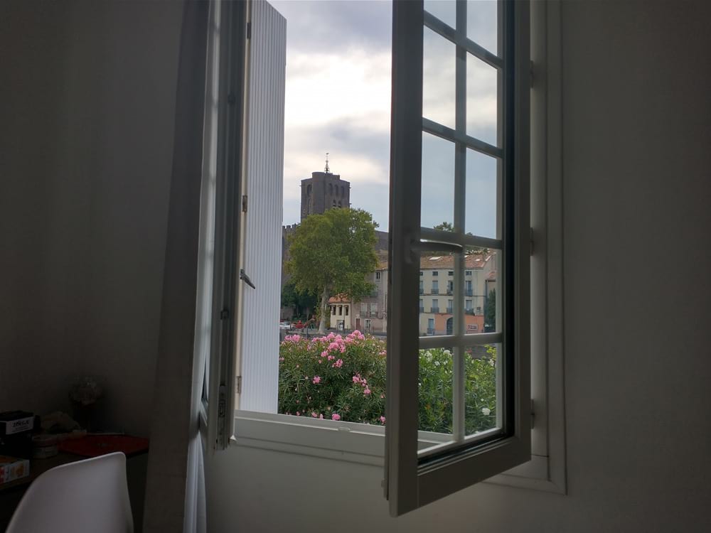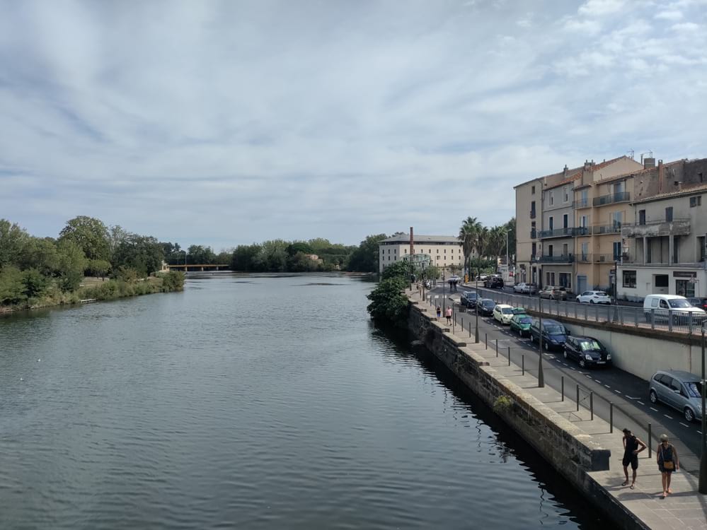 I arrived first, and appreciated Kristian’s choice of a riverfront hotel just a few blocks from the station, not at all difficult to wheel my luggage to. Hotel Aruar‘s friendly owners let me choose between two rooms with a view of the Hérault. After using wifi in the lobby for a bit (no good in the room), I went to see what food I could find to share when Kristian arrived, too late for restaurants. It was just August 30, still high season price on the room, but clearly out of season around town. Several of the riverfront restaurants were closed, stores were closed or closing early; there was no place open to get a top-up to reactivate my French phone number. I got some drinks and food at a poorly-stocked, poorly-cleaned little Spar grocery, and a bit of carryout food from an indifferent restaurant on the plaza just past the bridge, and eventually we picnicked sitting quayside – where a couple of fellows cheerily offered to share their drinks, but did not persist or remain.