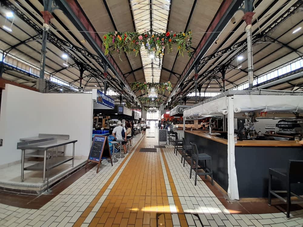 The indoor central market – Les Halles – has fewer vendors than the others I’ve seen in the region (Nîmes, Avignon, Montpellier) (in fact, a number of stalls were curtained today) but more little restaurants, which stay open beyond market hours. I’ve seen quite a few wine bars even in my limited strolls, and noted a number of tapas restaurants – unsurprising, as there’s a Spanish influence here. The border is not that far away – an hour and a half by train or car.
