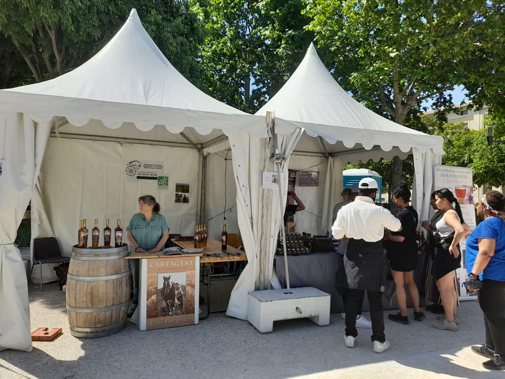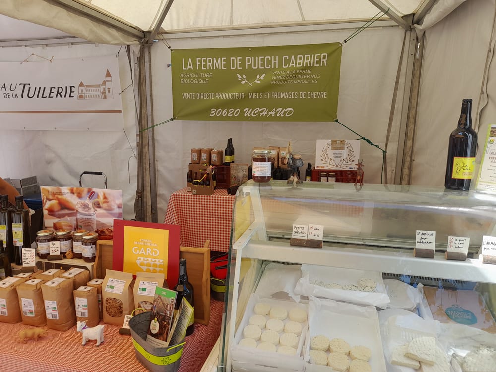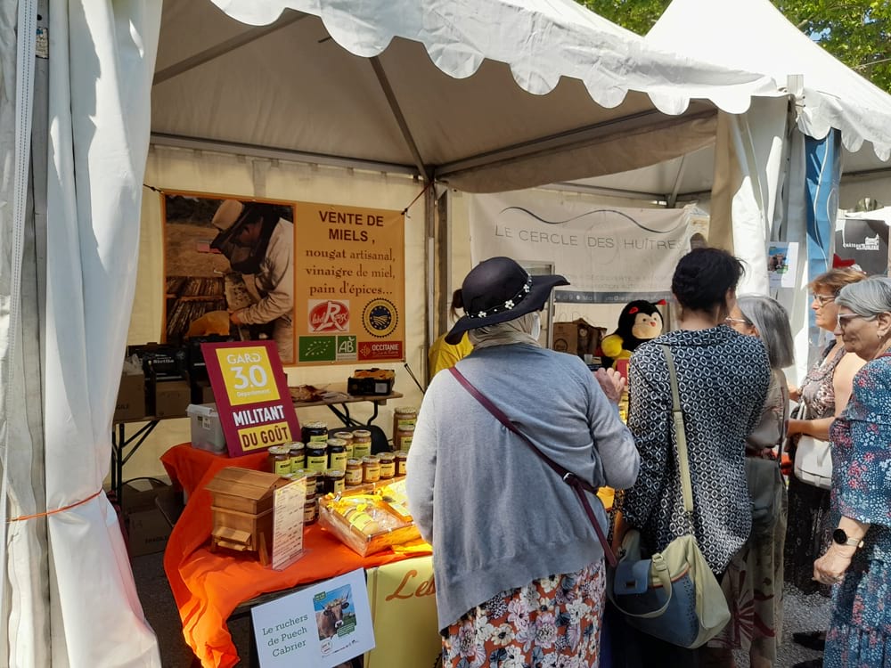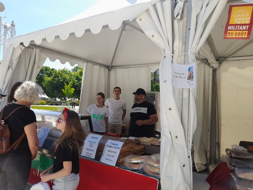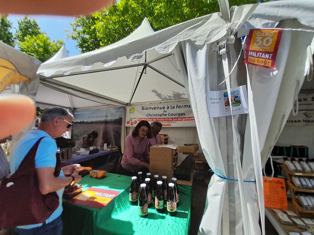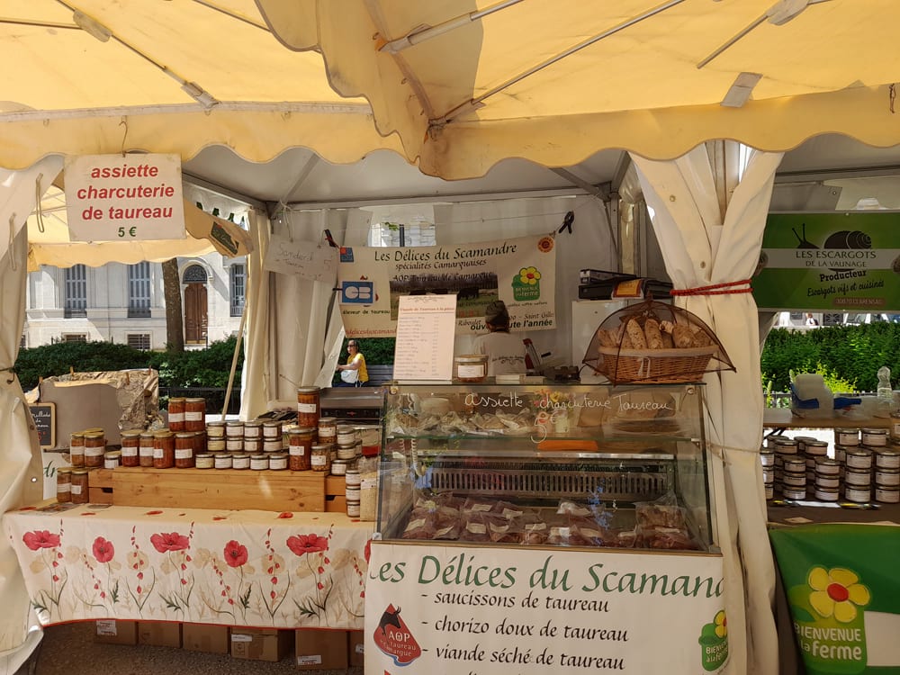 What luck, to arrive in Nîmes just before the weekend of this fair, May 14-15. Here’s a look around midday Saturday. Signs everywhere proclaim “Le Gard – Militant du Goût” (the department of the Gard – an activist/partisan/campaigner for taste). There’s wine, beer, whiskey, vinegars, olives and olive oil, lavender, duck and pork rillettes, foie gras, sausages, fresh lamb and beef, smoked fish and meats, honey, jams, baked goods, cheeses, fried snacks, fresh eggs, cherries, and probably more that I’ve forgotten. Most things are available to taste for free, or to buy a sample of for 2-6 euros. Relaxed, friendly but passionate vendors are ready to explain what distinguishes their products, so there’s plenty of opportunity for conversation and education in addition to the fun of exploring many flavors. Another delightful day in France. A la découverte! (Here’s to discovery!)