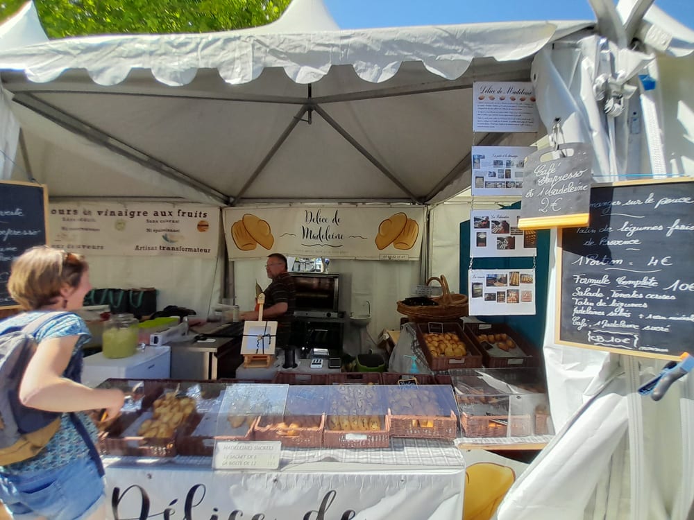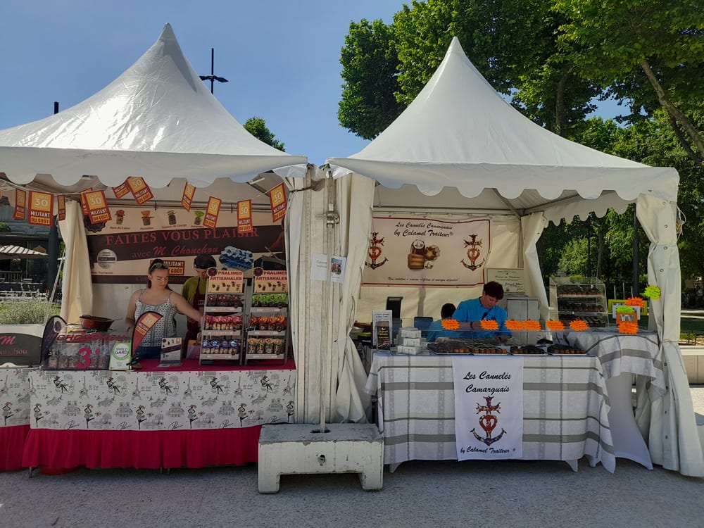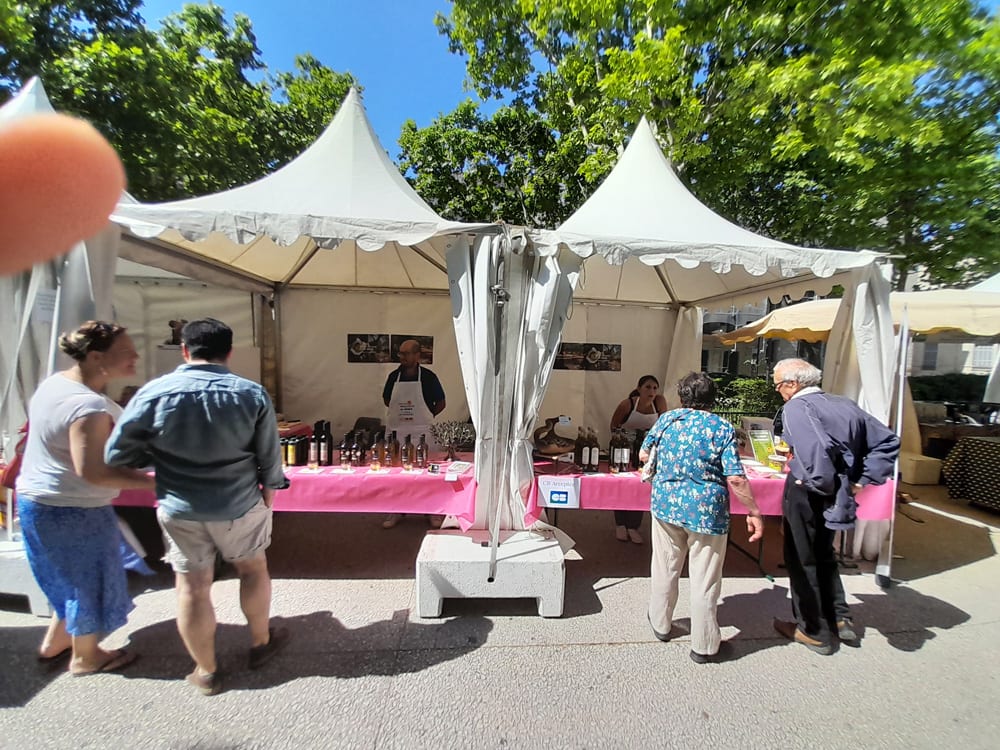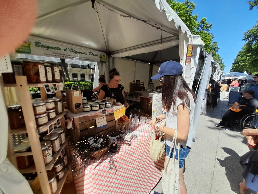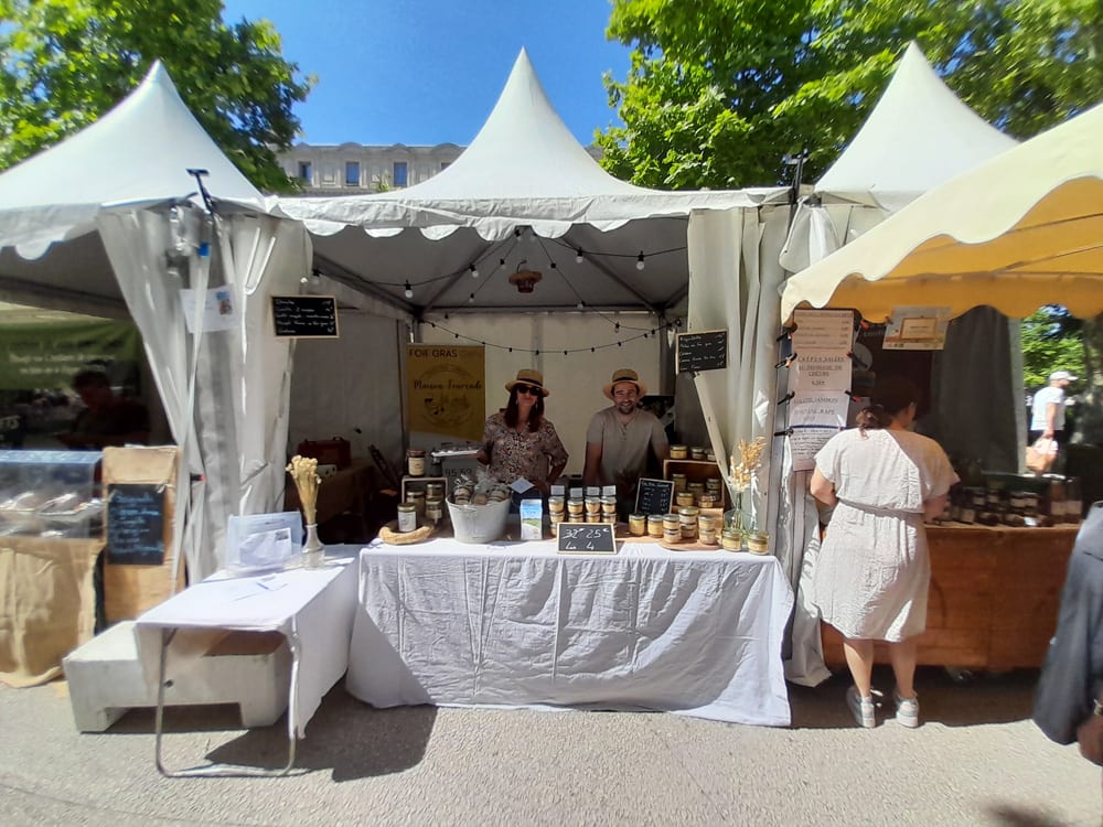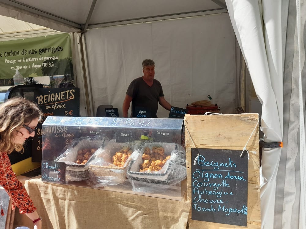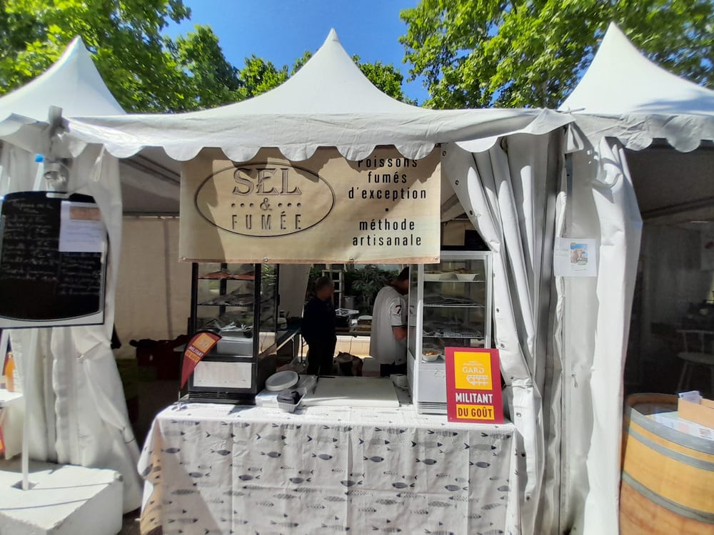 What luck, to arrive in Nîmes just before the weekend of this fair, May 14-15. Here’s a look around midday Saturday. Signs everywhere proclaim “Le Gard – Militant du Goût” (the department of the Gard – an activist/partisan/campaigner for taste). There’s wine, beer, whiskey, vinegars, olives and olive oil, lavender, duck and pork rillettes, foie gras, sausages, fresh lamb and beef, smoked fish and meats, honey, jams, baked goods, cheeses, fried snacks, fresh eggs, cherries, and probably more that I’ve forgotten. Most things are available to taste for free, or to buy a sample of for 2-6 euros. Relaxed, friendly but passionate vendors are ready to explain what distinguishes their products, so there’s plenty of opportunity for conversation and education in addition to the fun of exploring many flavors. Another delightful day in France. A la découverte! (Here’s to discovery!)