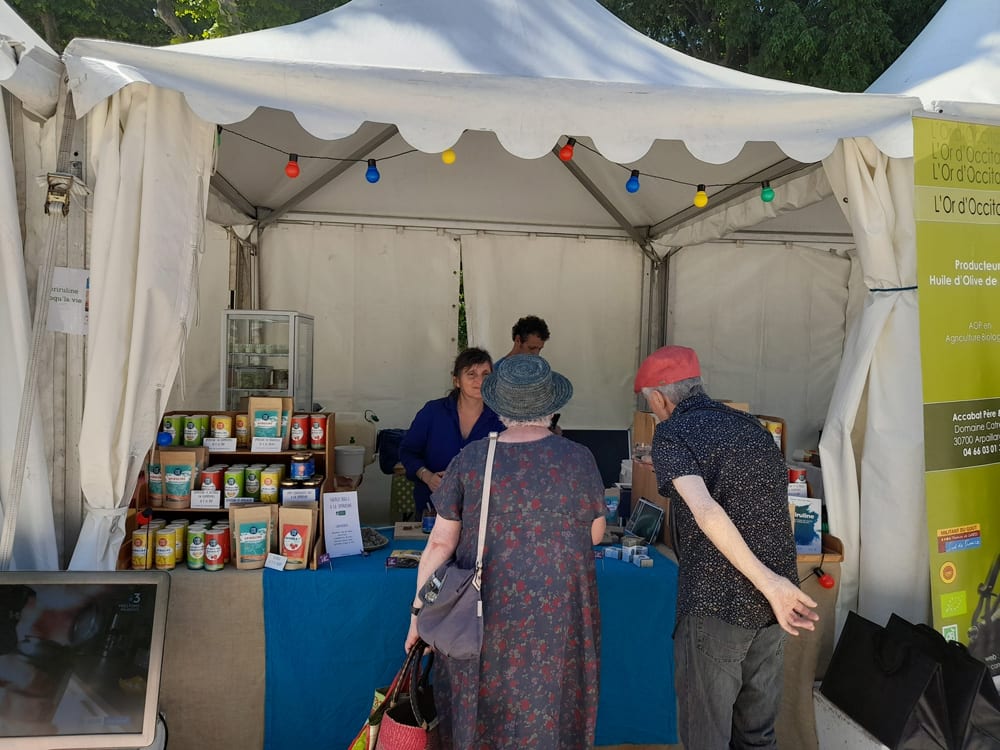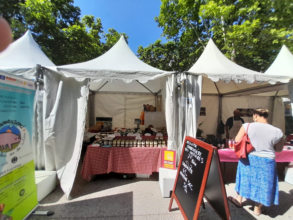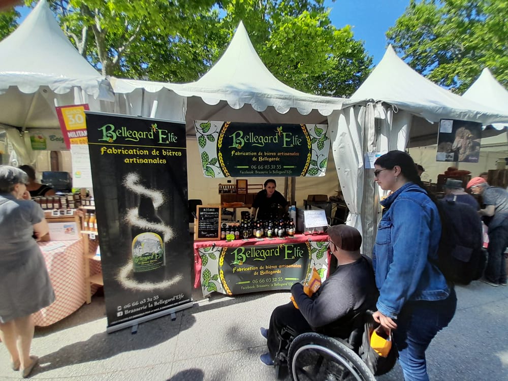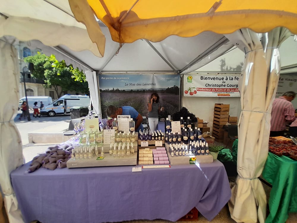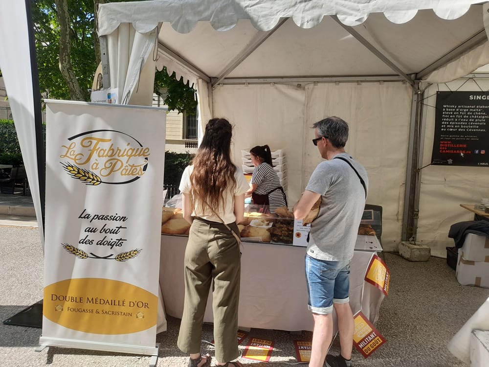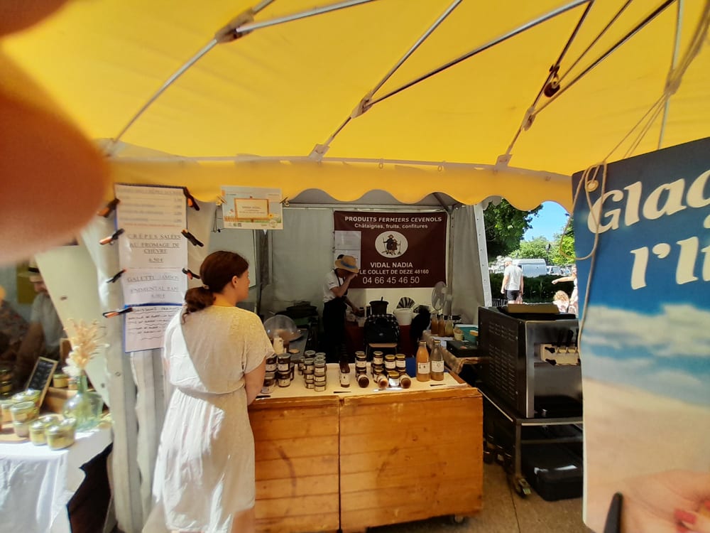 What luck, to arrive in Nîmes just before the weekend of this fair, May 14-15. Here’s a look around midday Saturday. Signs everywhere proclaim “Le Gard – Militant du Goût” (the department of the Gard – an activist/partisan/campaigner for taste). There’s wine, beer, whiskey, vinegars, olives and olive oil, lavender, duck and pork rillettes, foie gras, sausages, fresh lamb and beef, smoked fish and meats, honey, jams, baked goods, cheeses, fried snacks, fresh eggs, cherries, and probably more that I’ve forgotten. Most things are available to taste for free, or to buy a sample of for 2-6 euros. Relaxed, friendly but passionate vendors are ready to explain what distinguishes their products, so there’s plenty of opportunity for conversation and education in addition to the fun of exploring many flavors. Another delightful day in France. A la découverte! (Here’s to discovery!)