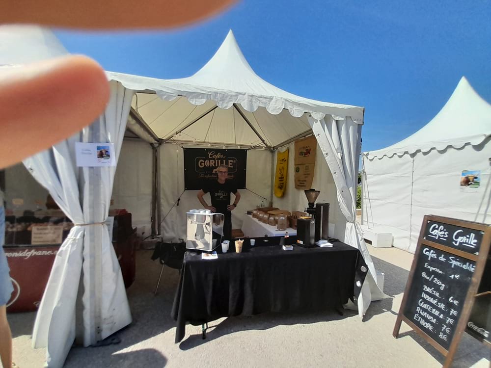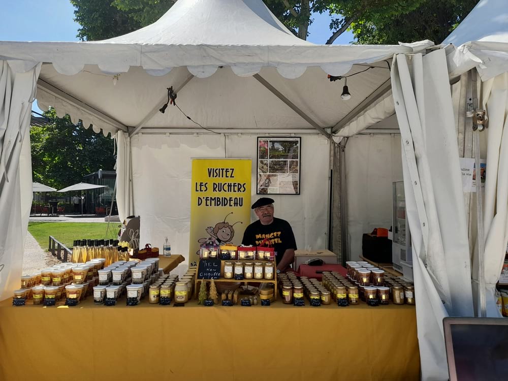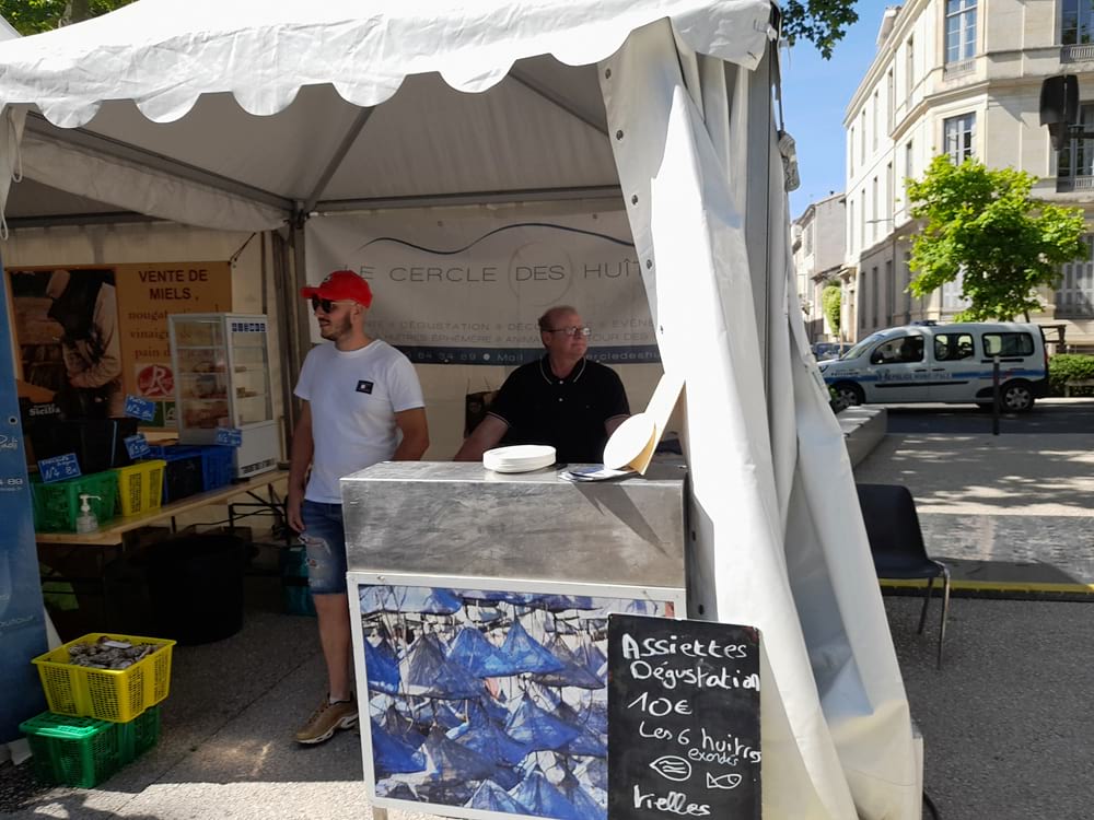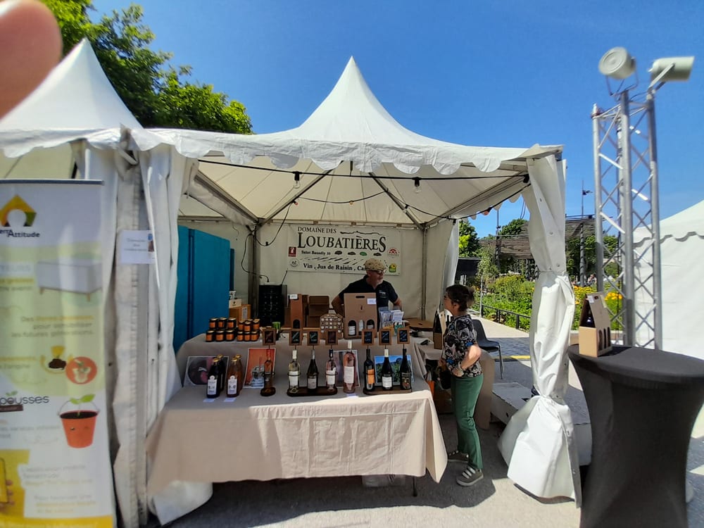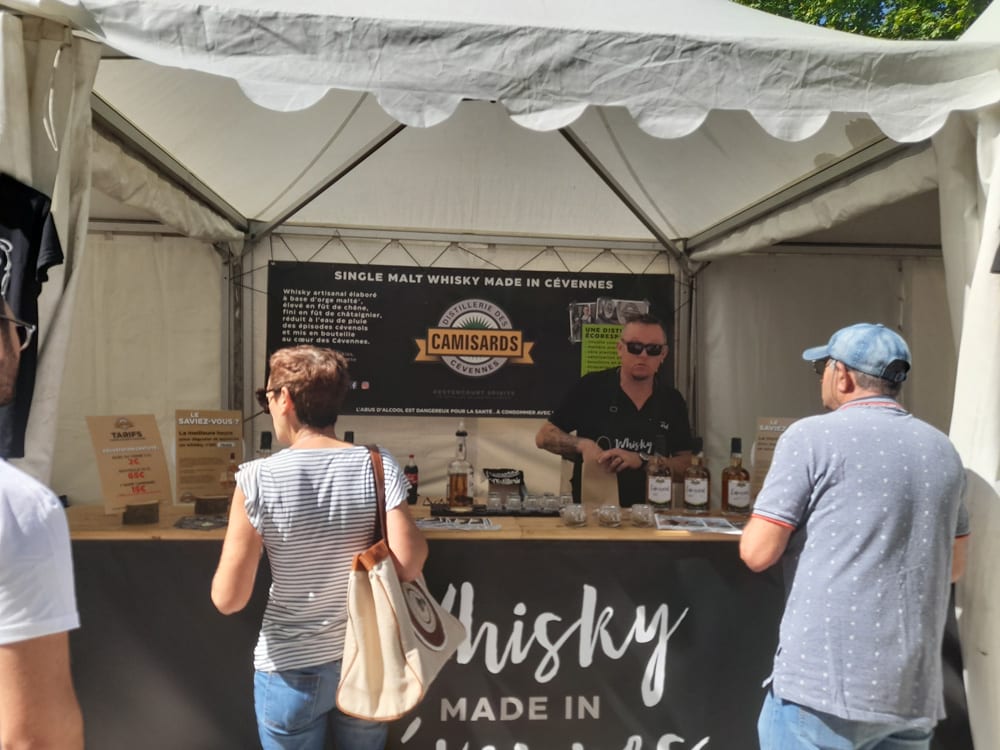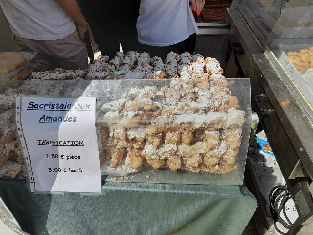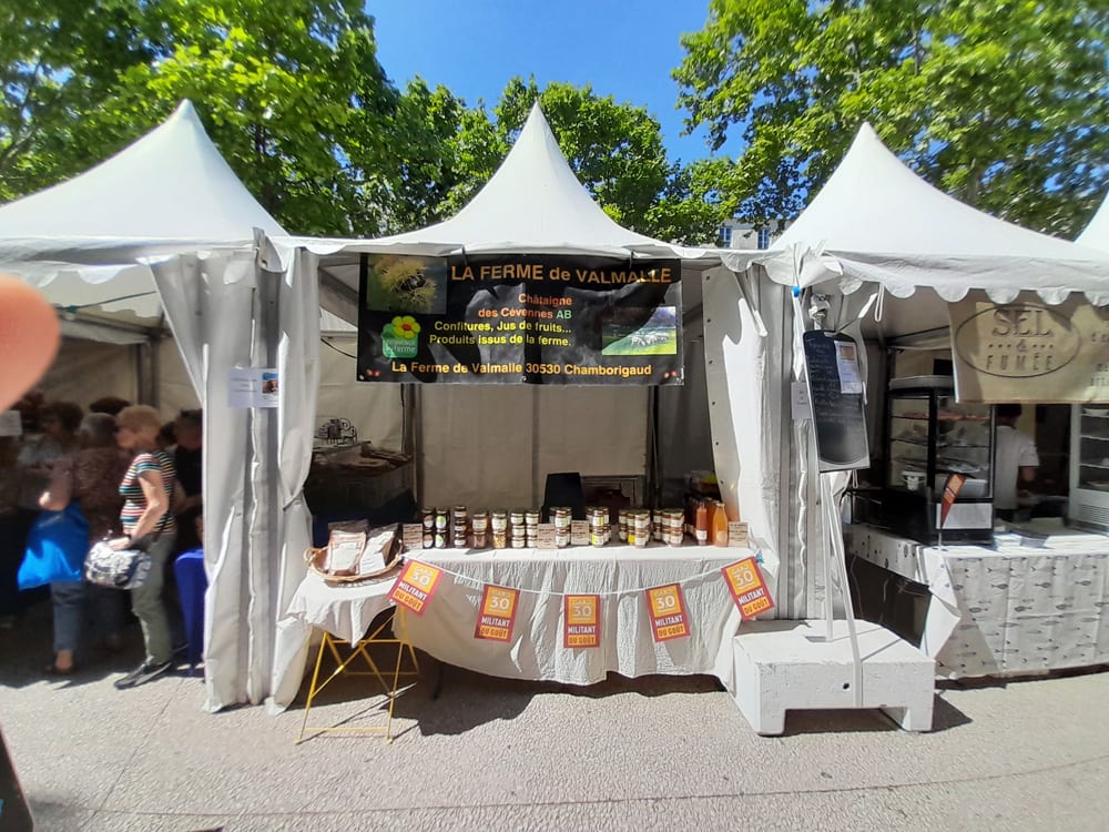 What luck, to arrive in Nîmes just before the weekend of this fair, May 14-15. Here’s a look around midday Saturday. Signs everywhere proclaim “Le Gard – Militant du Goût” (the department of the Gard – an activist/partisan/campaigner for taste). There’s wine, beer, whiskey, vinegars, olives and olive oil, lavender, duck and pork rillettes, foie gras, sausages, fresh lamb and beef, smoked fish and meats, honey, jams, baked goods, cheeses, fried snacks, fresh eggs, cherries, and probably more that I’ve forgotten. Most things are available to taste for free, or to buy a sample of for 2-6 euros. Relaxed, friendly but passionate vendors are ready to explain what distinguishes their products, so there’s plenty of opportunity for conversation and education in addition to the fun of exploring many flavors. Another delightful day in France. A la découverte! (Here’s to discovery!)
